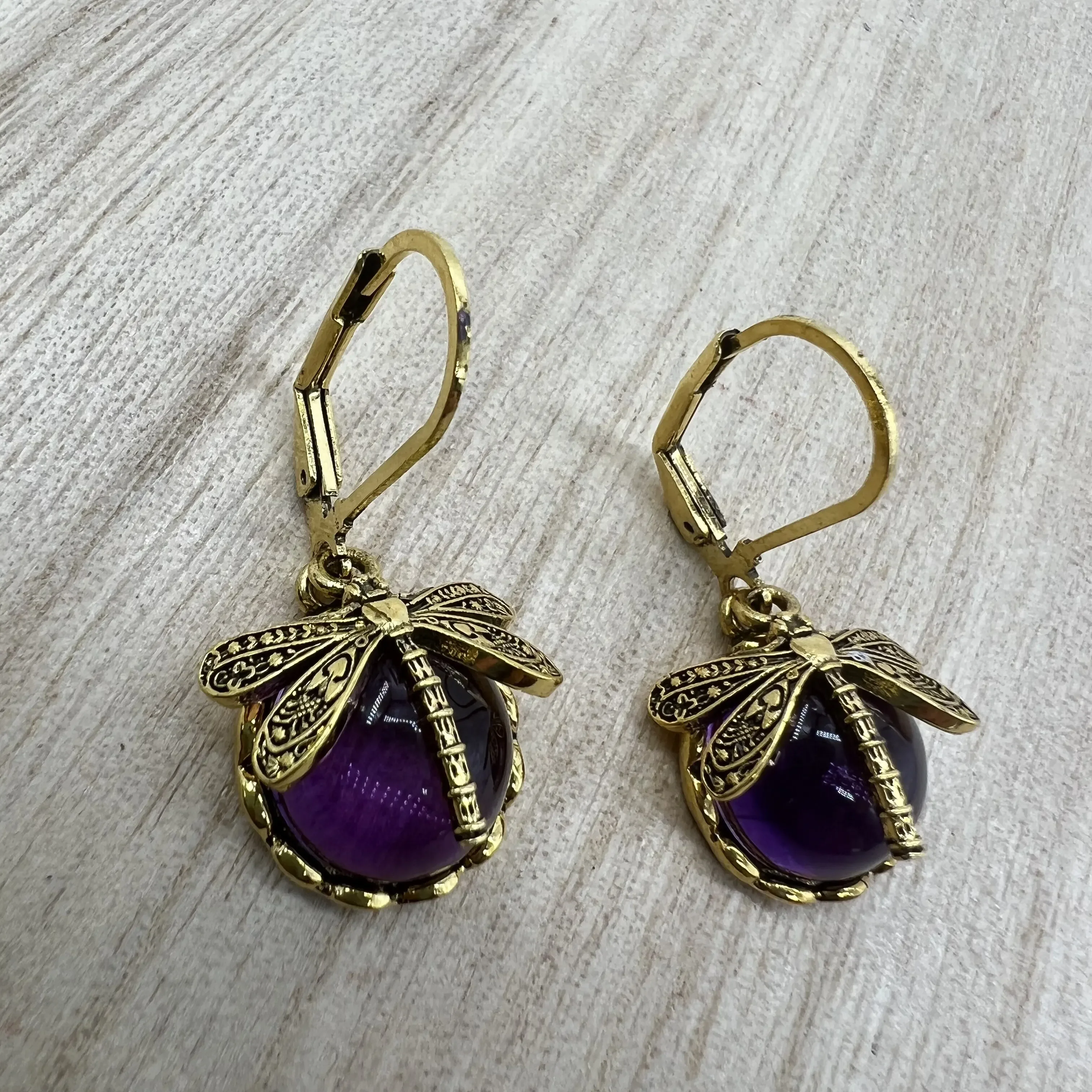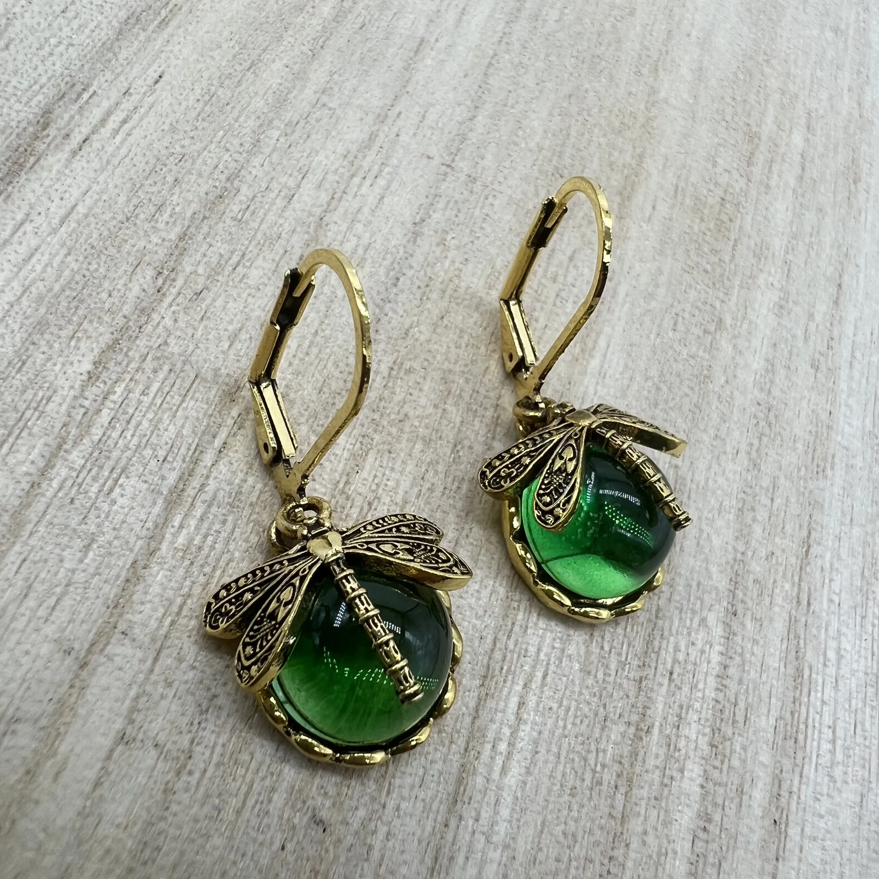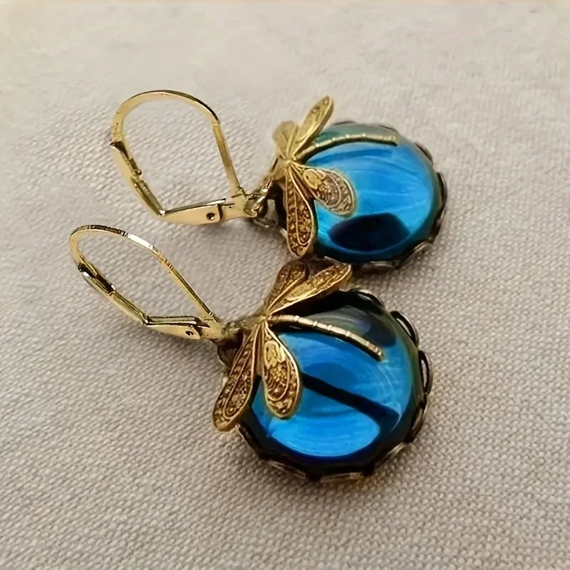 Vintage Metal Dragonfly Earrings Inky Blue Moonstone Brass Glass Cabochon Vintage Victorian Gifts for Women